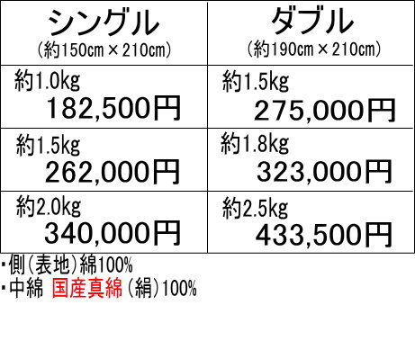 ![]() 真綿を熟練職人が二人向き合い手作業で同じ力加減で1つ1つ広げていき引き伸ばします。この「手引き」作業を何度も繰り返し布団サイズに仕上げ、長浜市にて最終工程の側(表生地)に入れる作業をし仕上げます。 側(表生地)加工 外側ぐるりにキルティング加工を内側に和綴じを施し偏り防いでおります。二種類中綿ズレ防止加工を施しいつまでも末永くご愛情頂けるよう最終お仕立てをしております。 *シングル1kgは肌掛け布団に最適です(ダブルは1.5kg) *上記価格表以外にお客様のお好みの大きさ、中綿の重さの指定などオーダーできます。またお見積もり無料にてご案内いたします。 *価格表内の重さは真綿の重さです。 *受注生産ですので、ご入金確認後作業を進めます。作業を進めますとキャンセルできませんのでご了承ください。 *作業開始より30日ほどで近江真綿布団発送いたします。(土日祝日含まず) *ご注文、お見積もりは電話・FAX・メールなどで賜ります。お気軽にお問い合わせください。 *発送はヤマト便140pサイズの発送となります。 |