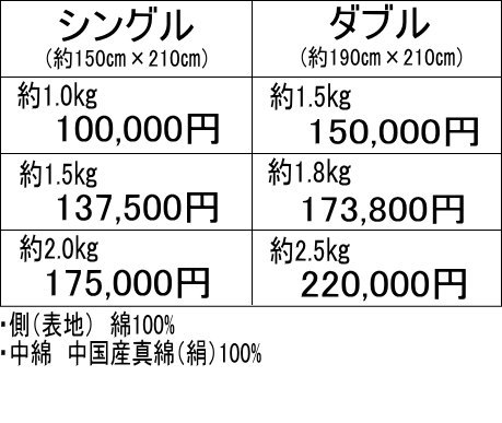 | 近江真綿布団価格表 | |